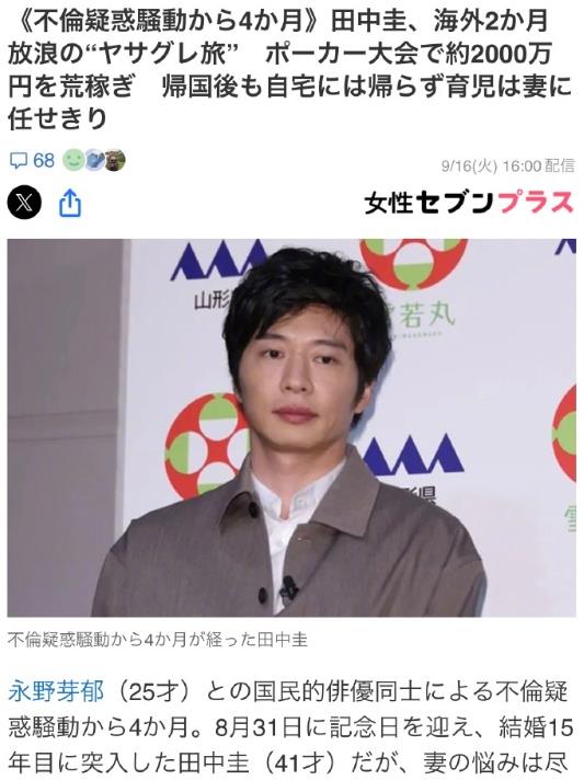 田中圭和妻子分居不離婚 玩撲克贏了兩千萬日元